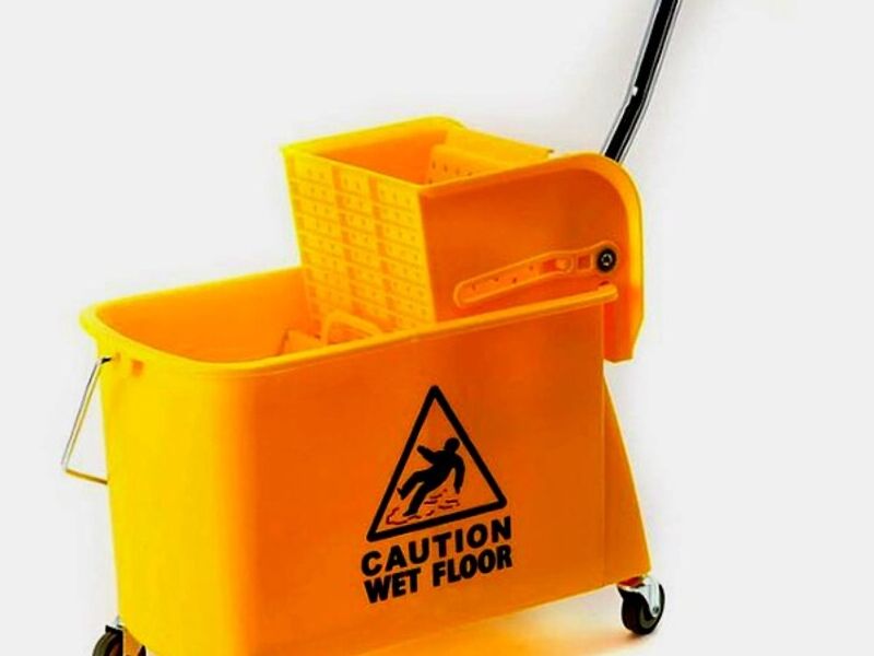 Recipiente diseñado para exprimir el exceso de agua de un trapeador.